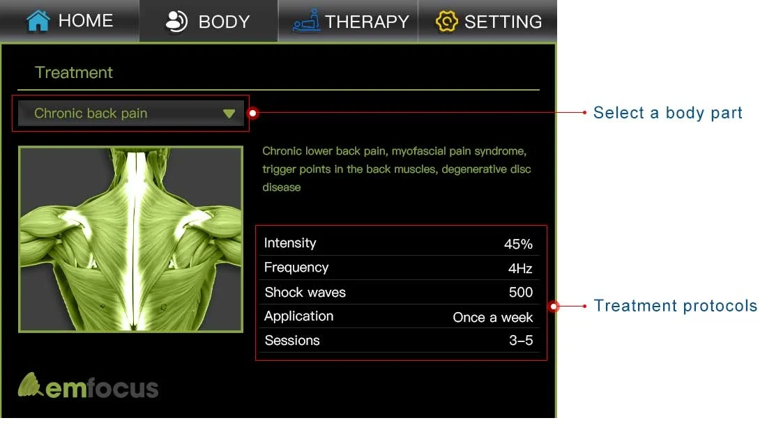 Какво може да направи emfocus? Ефективността на фокусираната ударно-вълнова терапия (Focused-ESWT) е не само по-висока, но и способността за заобикаляне на повърхността на кожата означава, че сензорната мрежа на кожата остава нестимулирана, което води до значително по-комфортна сесия.
